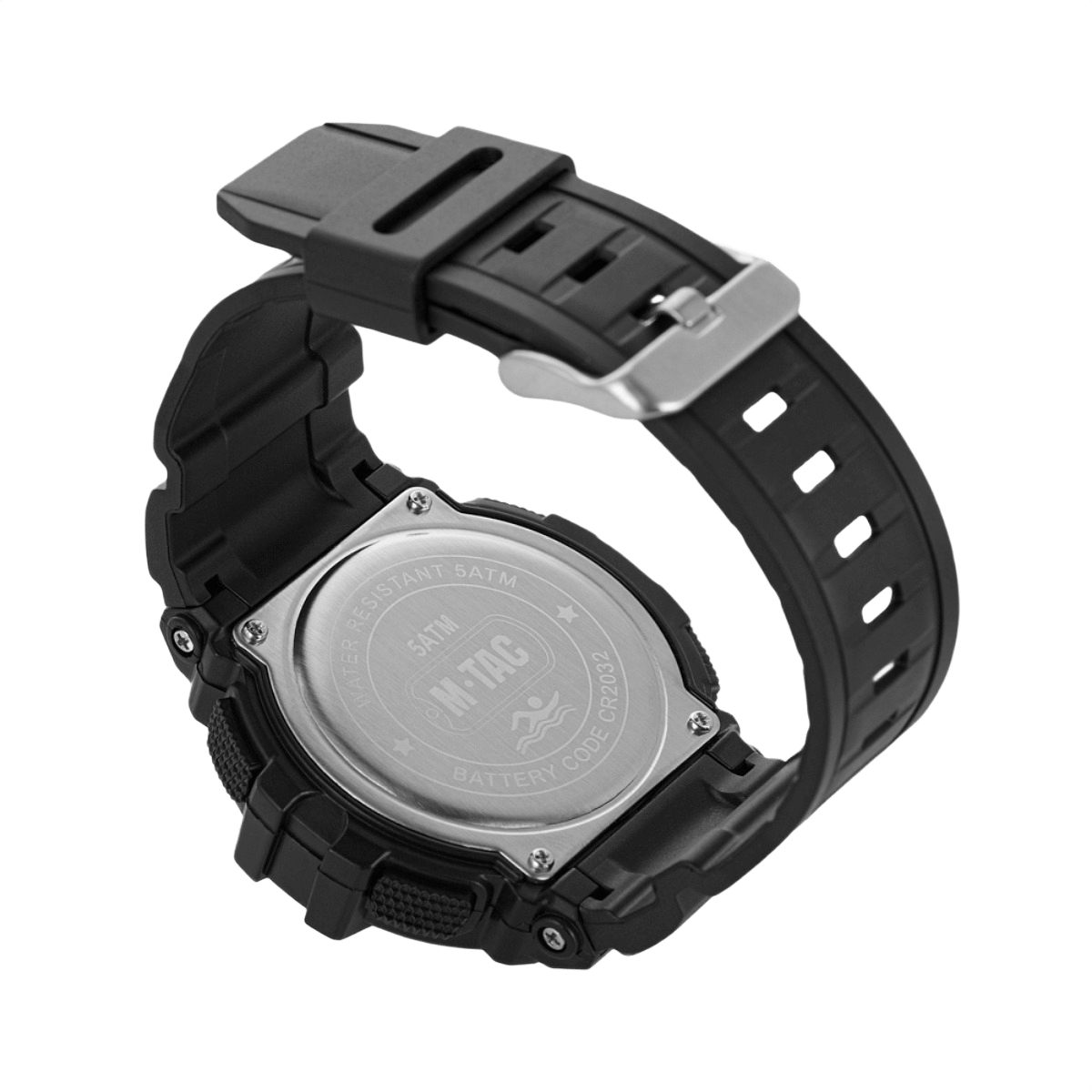- Bagcover: Stål med markeringer “WATER RESISTANT 5ATM” og “BATTERY CODE CR2032”