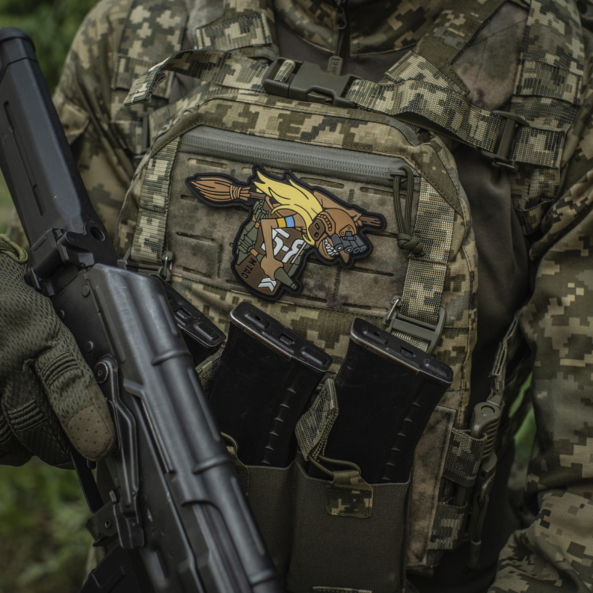 M‑Tac Patch Baba-Yaga Horizontal er en detaljeret PVC-patch med 3D-effekt, der hylder den ukrainske UAV "Baba Yaga". Patchen viser juniorsergent Baba Yaga med GPNVG-18 natkikkert og PG-7M granater, klar til aktion under dække af natten. Den voluminøse 3D-teknologi gør motivet realistisk og iøjnefaldende.