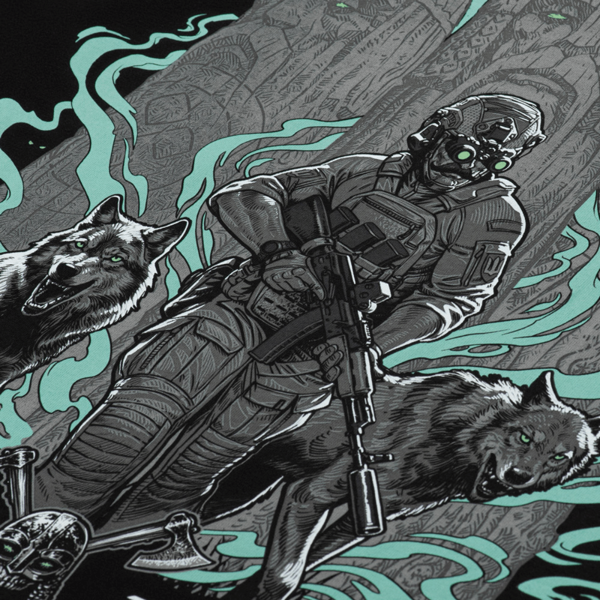 M-Tac T-Shirt Our Land hylder Ukrainas historie og modige soldater. Printet viser en moderne militærmand omgivet af en ugle og en ulv, symboler på visdom, loyalitet og styrke, samt gamle gudefigurer, der fremhæver ukrainsk krigerånd gennem tiden.
