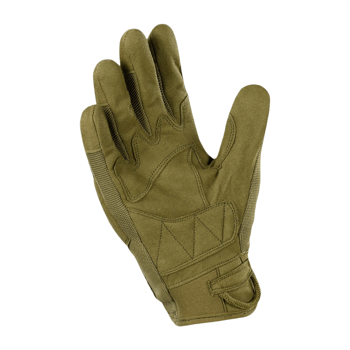 Handskerne har forstærkede kno-pads, der dæmper stød, non-slip overflade på håndfladen for sikkert greb om våben, kniv eller værktøj samt en forstærket løkke på bagsiden til fastgørelse på udstyr.