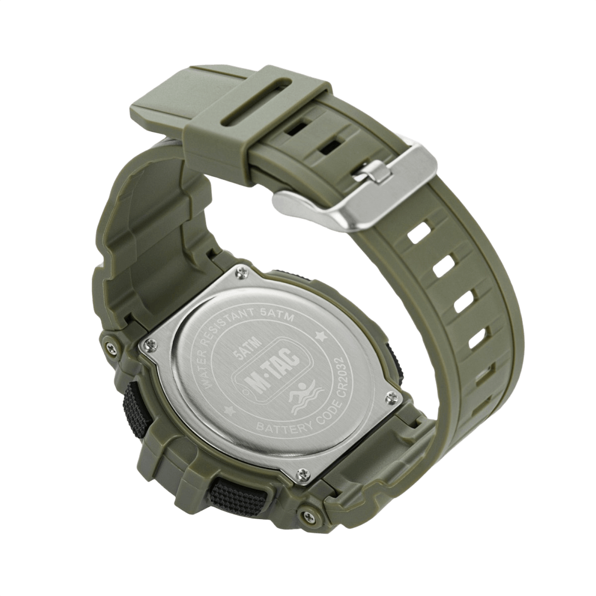 • Bagcover: Stål med markeringer “WATER RESISTANT 5ATM” og “BATTERY CODE CR2032”
