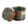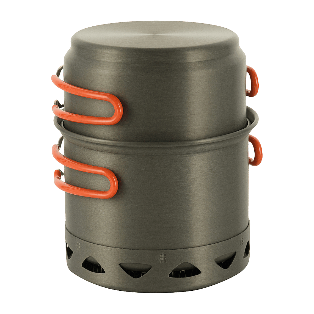 Sættet består af en gryde på 1,5 liter og en skål/pande på 0,4 liter, som gør det nemt at tilberede mad eller koge vand over en brænder. De varmebestandige håndtag beskytter mod forbrændinger, og alt kan pakkes sammen i den medfølgende netpose med snøre, der gør transport og opbevaring let.