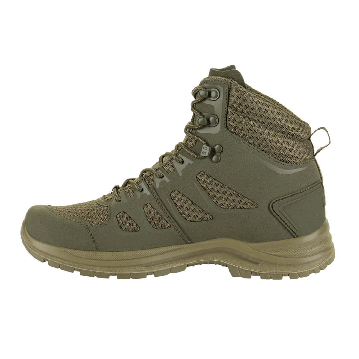 Overdelen er fremstillet i et kombineret materiale af åndbart mesh forstærket med syntetisk nubuck, hvilket sikrer optimal ventilation og et behageligt mikroklima i støvlen. Den tætte vævning i det ydre mesh forhindrer sand og støv i at trænge ind, samtidig med at støvlerne bevarer deres høje åndbarhed. En ekstra plade på pløsen beskytter mod snavs, mens den forstærkede tå og hæl giver ekstra beskyttelse og øger holdbarheden.