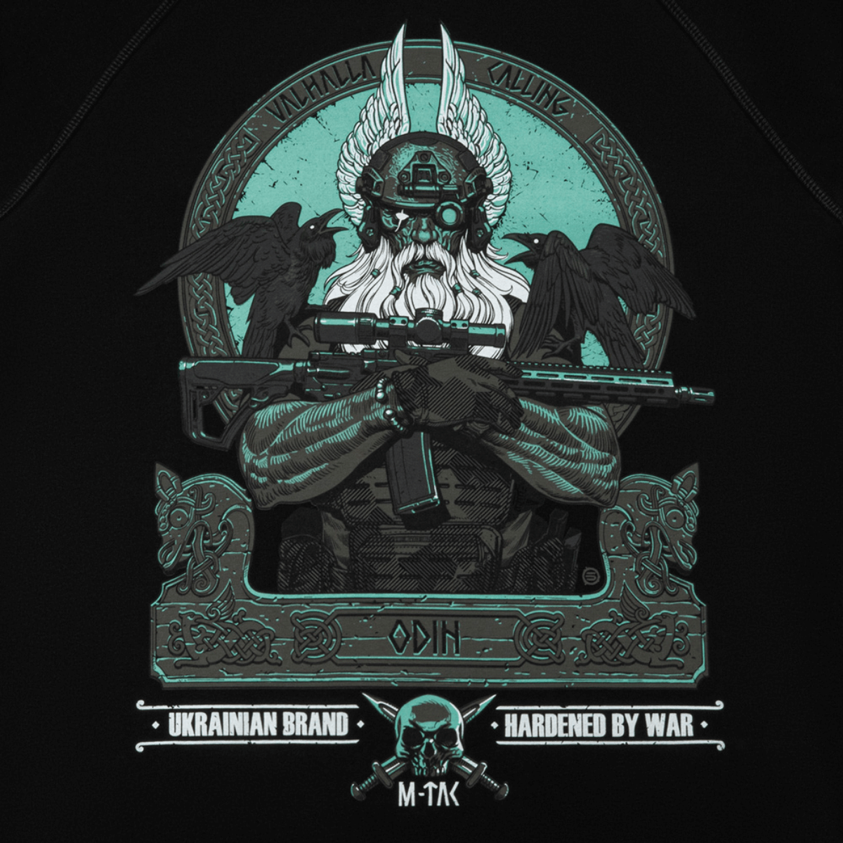 - Motiv: Odin med AR-15, ravnene Hugin og Munin, “Valhalla Calling”-inskription